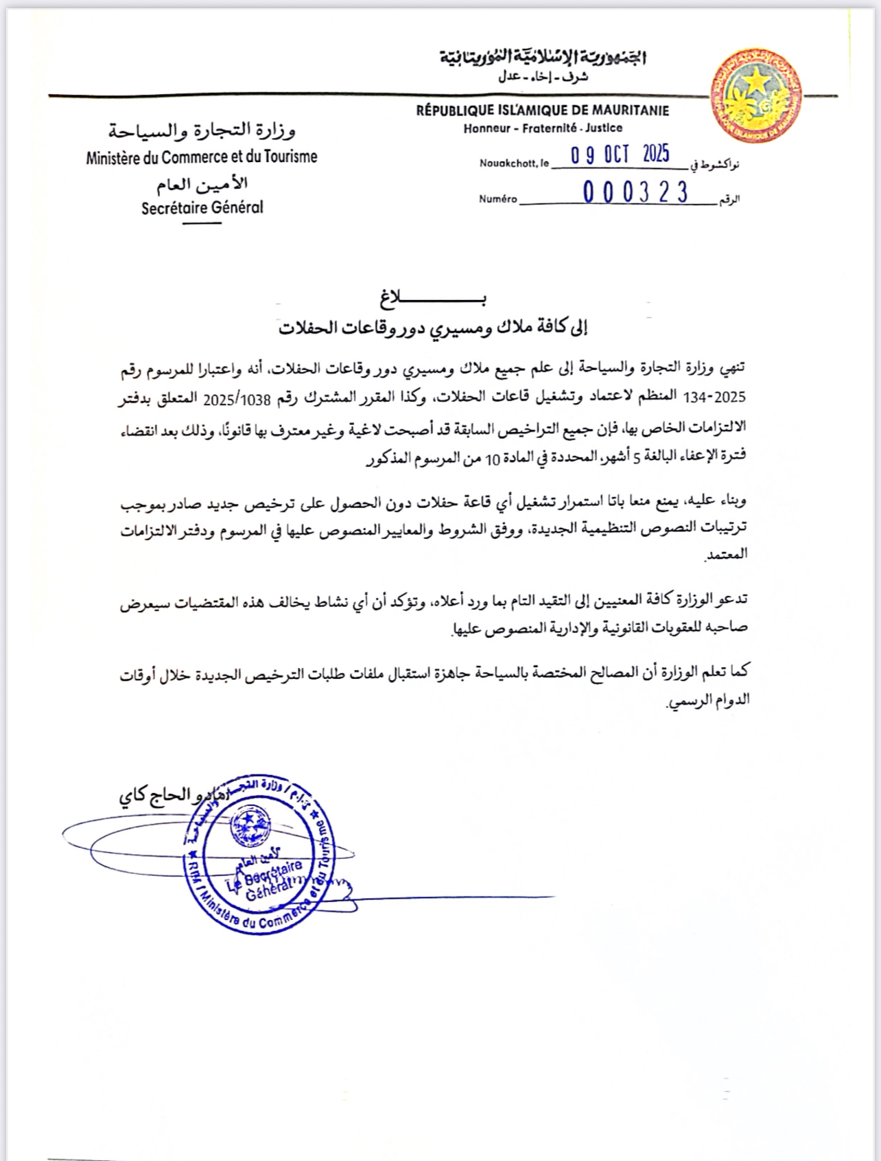 أشرفت معالي وزيرة التجارة والسياحة السيدة زينب بنت أحمدناه، صباح اليوم الإثنين بقصر المؤتمرات “المختار ولد داداه” في نواكشوط، على إطلاق البرنامج الوطني لتصنيف المنشآت الفندقية، وذلك بحضور معالي وزيرة الإسكان والعمران والاستصلاح الترابي السيدة الناها بنت حمدي ولد مكناس، ووالي ولاية نواكشوط الغربية ، وعدد من المسؤولين الحكوميين وممثلي الهيئات السياحية والفاعلين في القطاع.
